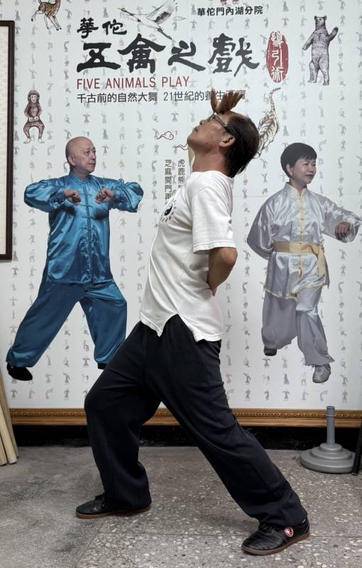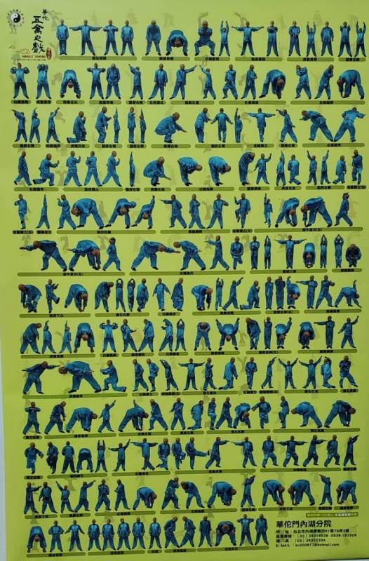 | 預備功1-3式 | 1.鹿站遠眺:活動頭部、頸部與下肢;踝關節、頸椎等可鬆弛筋骨 2.熊俯伸腰:活動背部、腰部與下肢;髖關節、腰椎等可鬆弛筋骨 3.白猿獻果:活動胸部、肩部與上肢;肩關節、肘關節等可鬆弛筋骨 |